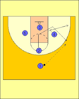 Corta por el centro de la zona, rodeando a 4 que le coloca un bloqueo indirecto para poder recibir abierto en la posición de alero.