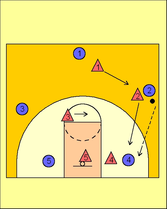 - Si el base es el que penetra o lanza, 2 ó 3, quién esté más cercano al base, ocupará su función en la defensa del 1er pase del base, y 2 ó 3 harán el balance defensivo, y 1 irá al rebote ofensivo. Figura 4.