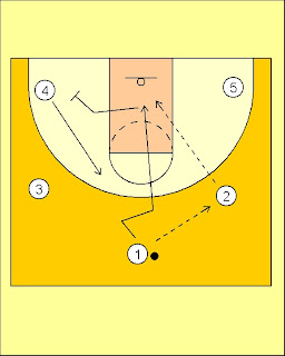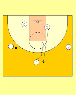 Con el balón en manos de 1, 3 pone un bloqueo horizontal a 5, para la recepción de este en el poste bajo. Figura 3. Al ser un bloqueo de un pequeño a un grande, obligamos a la defensa a no cambiar en defensa si no quieren que se produzca un missmatch.