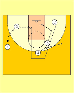 Tras el bloqueo de 2 a 3, el jugador 2, Carrol o Pocius, suben a la frontal del aro recibiendo bloqueos consecutivos de 5 y de 4. Figura 2. De esta manera el base 1, tiene las dos opciones de pase: a 3 en el poste bajo o a 2 en la frontal del aro.