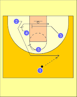 El movimiento se juega a partir de la distribución mostrada en la Figura 1. El jugador sube desde línea de fondo para recibir el lateral, recibiendo bloqueos indirectos consecutivos de 4 y de 5. El poste 4, Boris Diaw, después de bloquear a 2, recibe bloqueo indirecto de 3, Batum, para buscar el balón en el poste bajo. Figura 1.