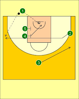 A continuación, el jugador 1, Diamantidis, después de poner el balón en juego, sube a la frontal recibiendo el bloqueo indirecto del poste 5, para recibir el balón de 2. Entonces, se juega un pick'n'roll frontal entre 1 y 5. Figura 2.