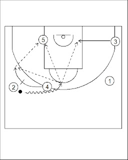 | If 2 doesn't pass to 5 then 4 sets a ballscreen for 2 and rolls to the left side wing. 2, 4 and 5 can play an offensive triangle. 2 dribbles to the rim, passes to 5 or passes to 3. |