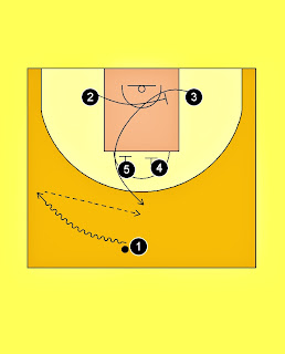 | Then 2 cuts from the right low post to the right side wing being staggered cross screened by 5 and 4. 3 passes to 2. |