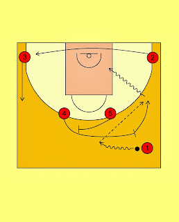 | If 1 passes to 5, then 3 plays a backdoor cut and 2 ups to the left side wing. 5 dribbles toward 2 for a hand-off pass. 5 rolls to the low post. |